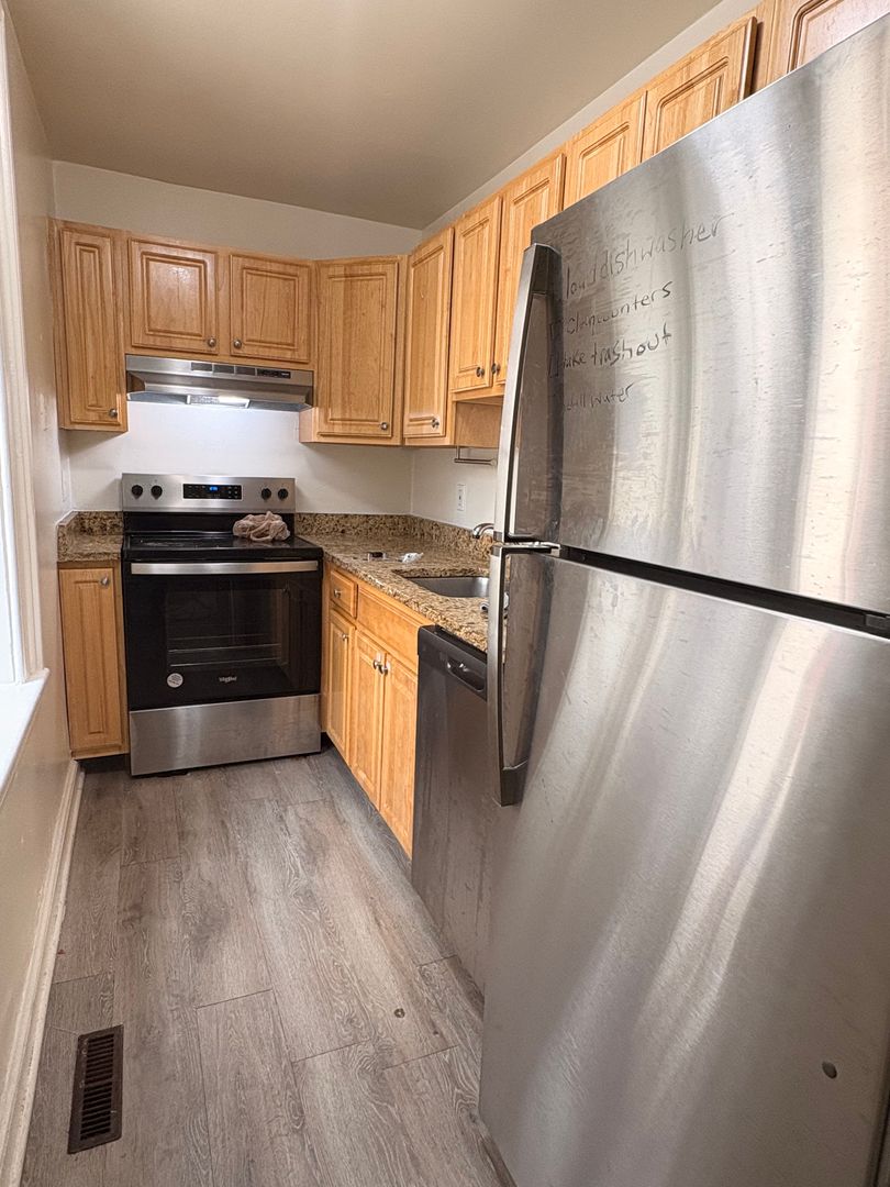 Spacious and private Mt Vernon 2bd/1ba apartment featuring front private entrance and two levels! Formal foyer with hardwood floors throughout main level which features large living room and galley-style kitchen. Living room adorned with ornamental fireplace, tall windows and a ceiling fan with overhead lighting. Lots of natural light fills the upper level! Galley-style kitchen has stainless steel appliances which include an electric stove, dishwasher and refrigerator. Lower level features two carpeted bedrooms with full bathroom. Washer/dryer in unit for ease! Utilities not included in rent. Available now!